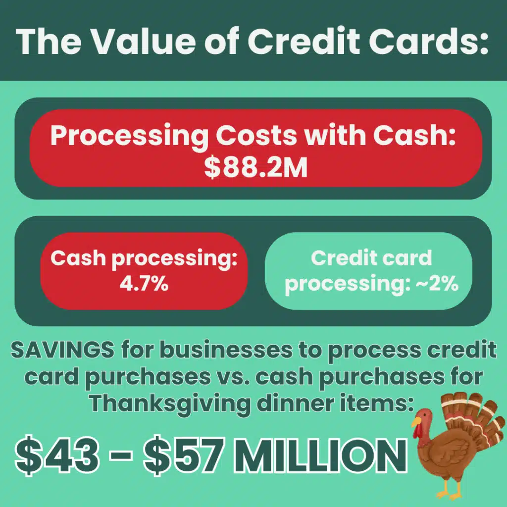 American families are expected to spend more than $1.8 billion on Thanksgiving meals this year. If all those purchases were made with credit cards, retailers would save an estimated $43 million to $57 million in processing costs compared with handling the same volume in cash, which would cost merchants more than $85 million to process, according to assumptions based on data from IHL and Nilson.